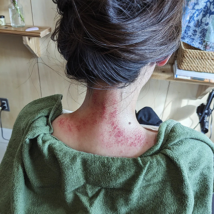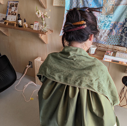 ヘナを塗布して待つ間、首肩をカッサでほぐし、コリを解消してめぐりを良くします。